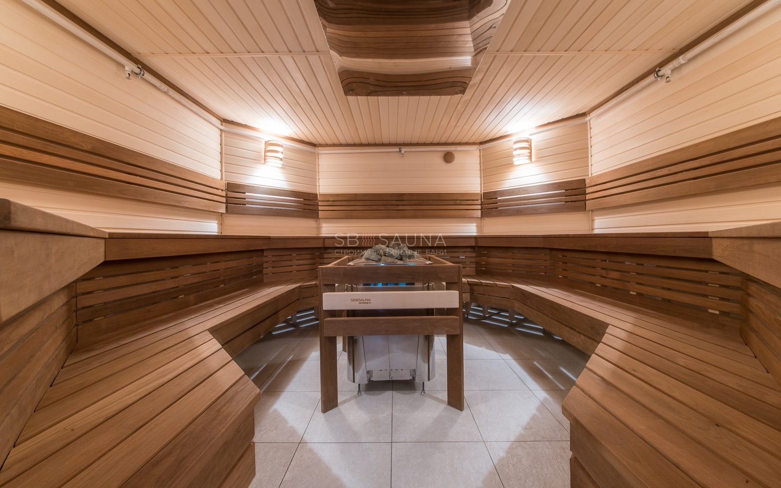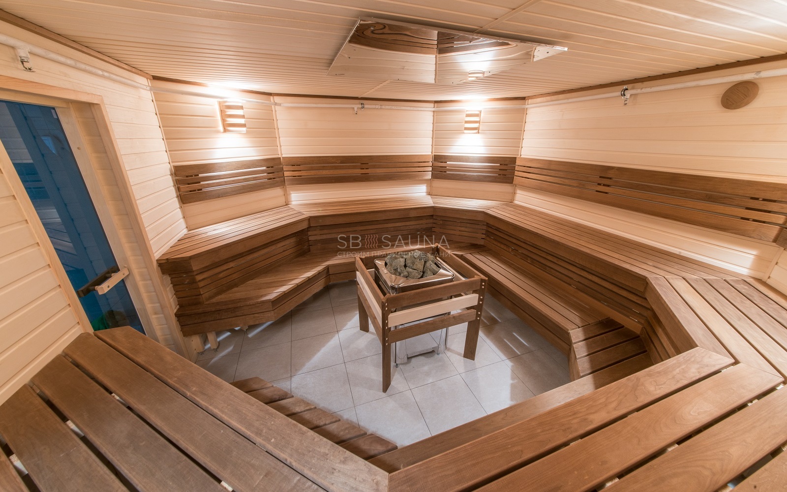 Мы остановились на вагонке из кавказской липе, и термоосине. Термическая обработка делает осину более плотной, снижается уровень впитывания влаги в дерево. Такое дерево выдержит постоянное пребывание в влажной среде, не разбухнет. Так как сауна используется не для домашнего пользования, необходимо было учесть большую ежедневную нагрузку.